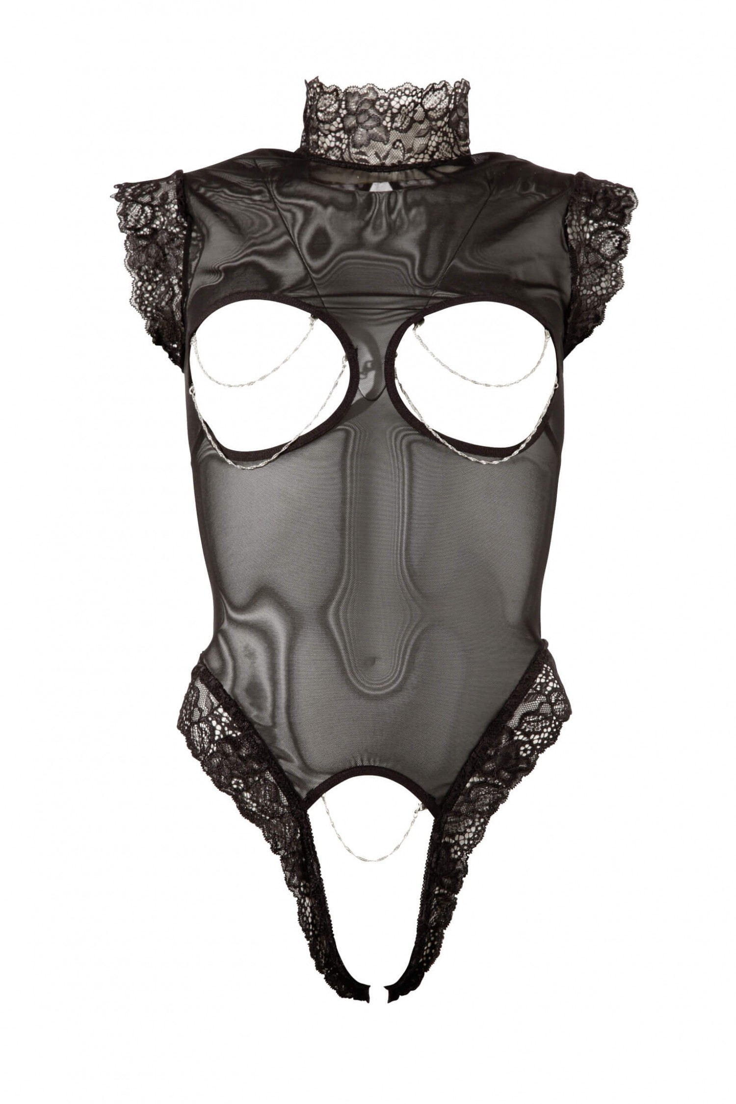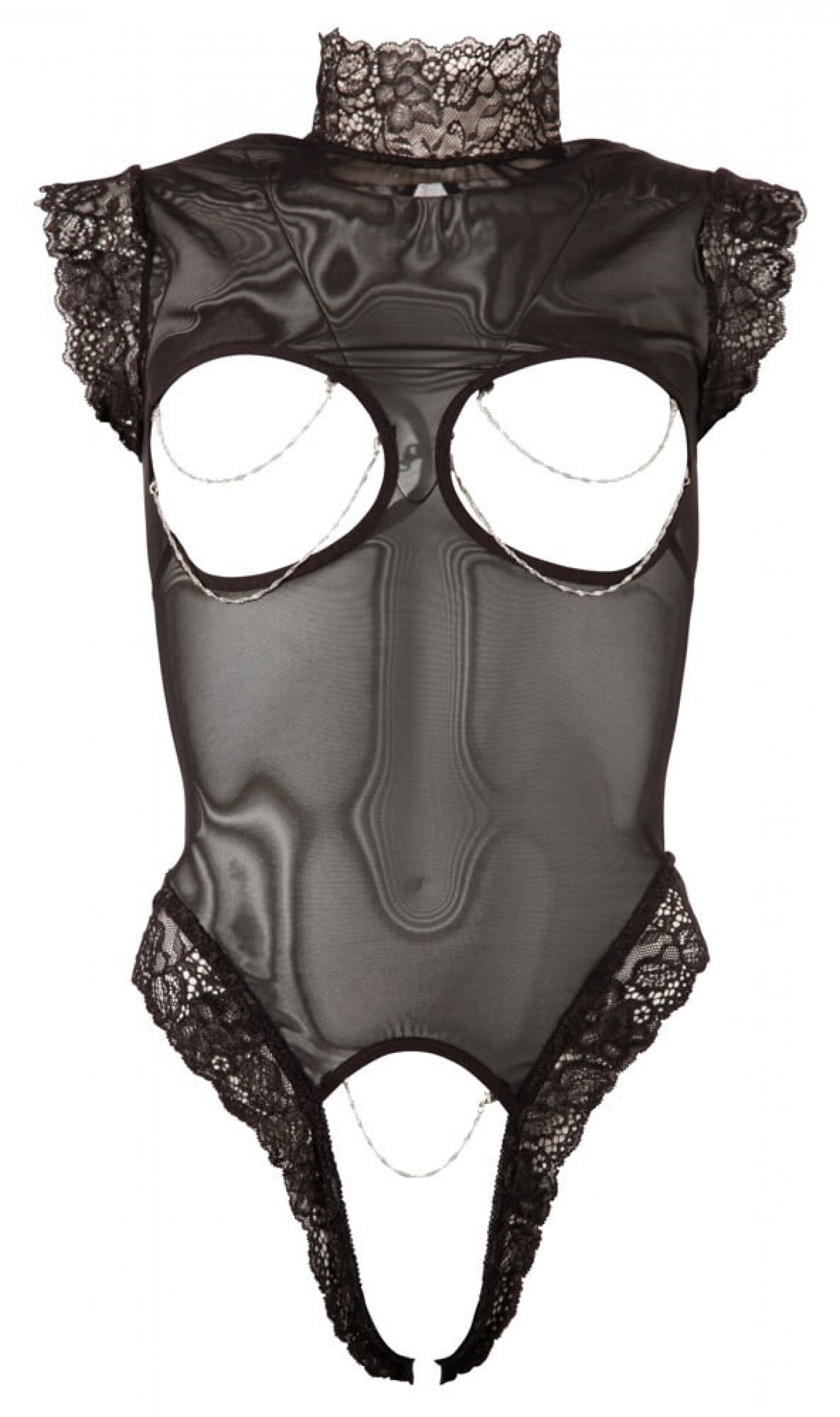 Áttetsző fekete, rugalmas anyagból készült body, fodros csipkeberakásokkal és különleges láncos díszítésekkel, melyek levehetőek.