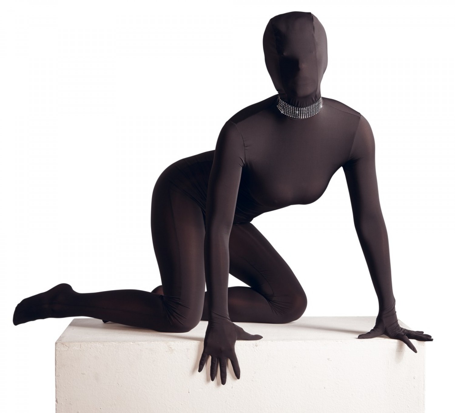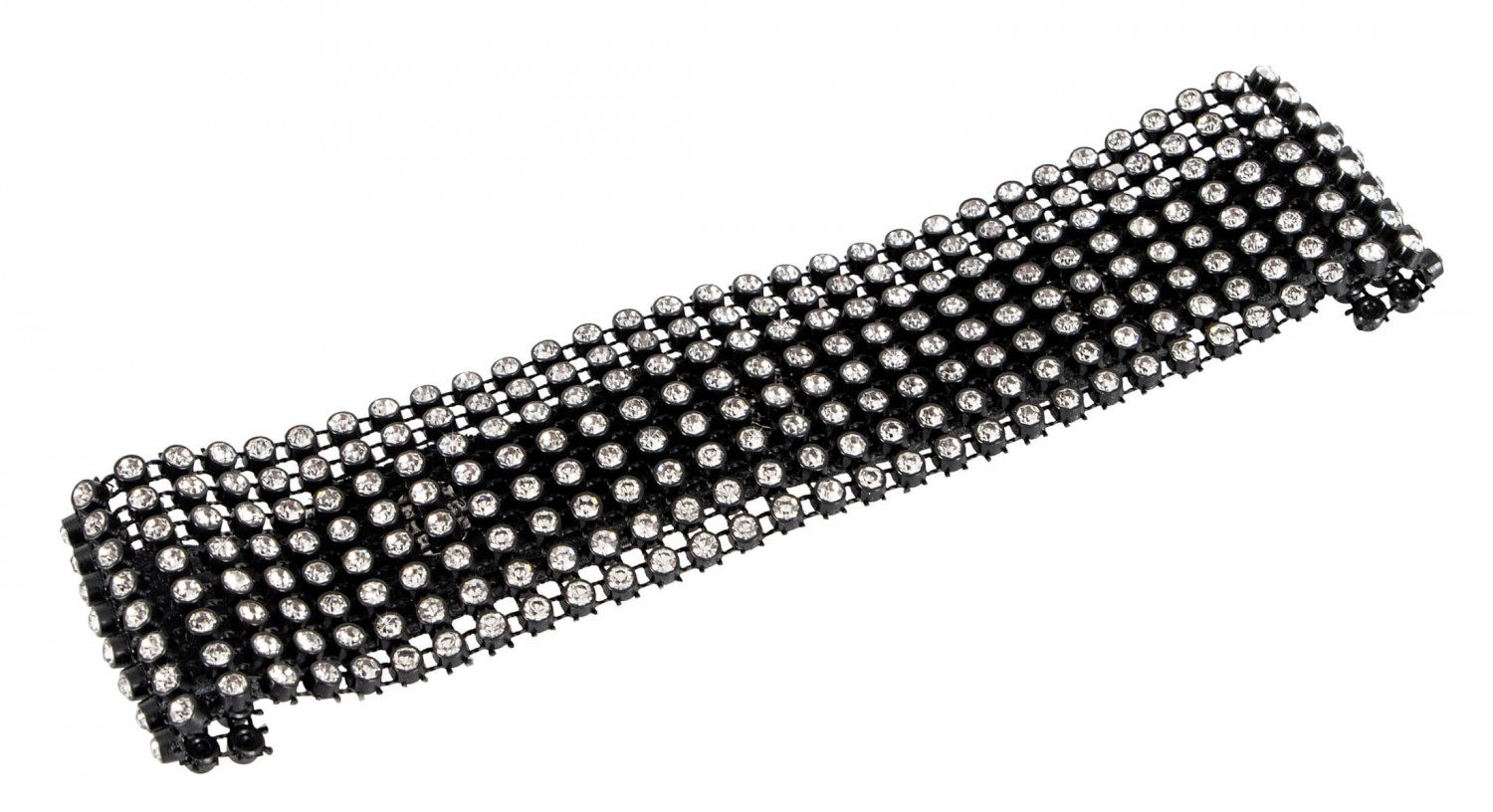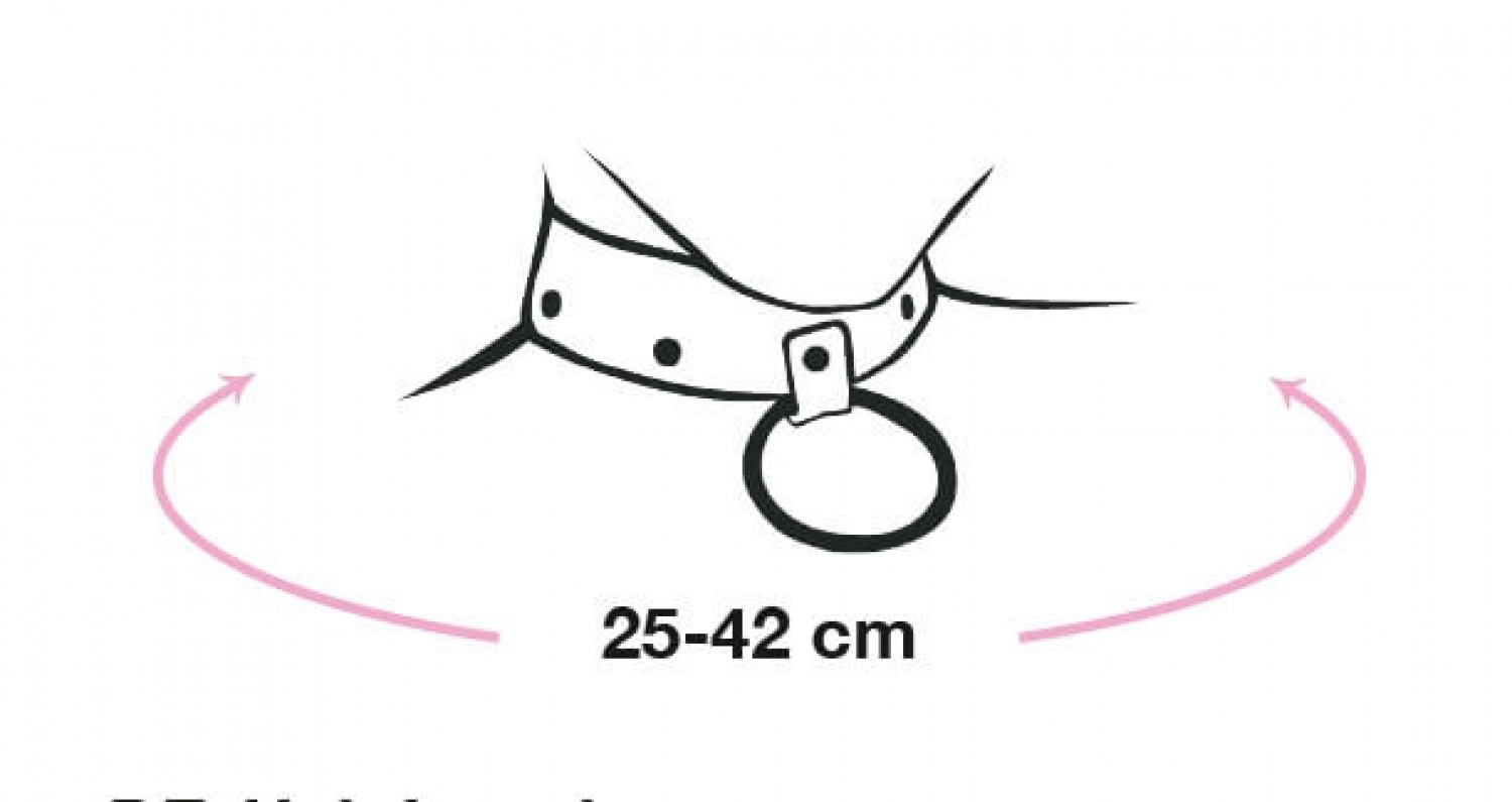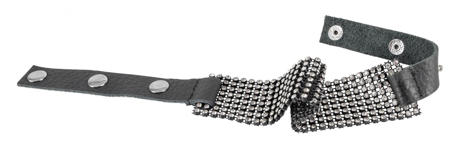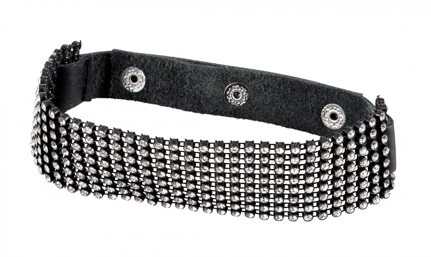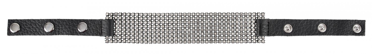 Elöl szélesebb, hátul keskenyebb kialakítású, fekete, hasított bőr pánttal készült, csillogó, fehér strasszokkal díszített nyakpánt, melynek mérete patenttal állítható 25 és 42cm között.