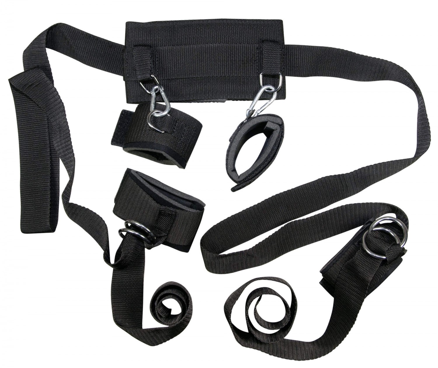 Kiváló szakítószilárdságú anyagból készült bondage csomag, nikkelmentes fém karabinerekkel és rögzítőgyűrűkkel.
