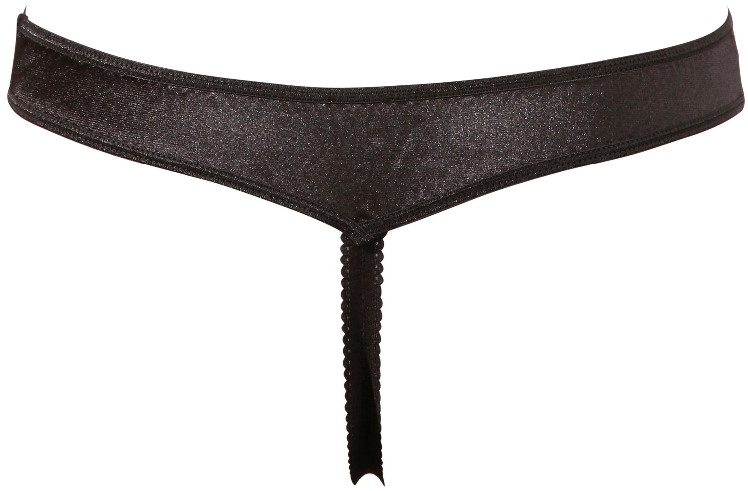 Csillogó, fekete szaténból készült erotikus tanga. Gyönyörű, finom kidolgozású csipkebetéttel az elején. Elöl végig és a szeméremnél is nyitott fazonban, így aktus közben is viselhető