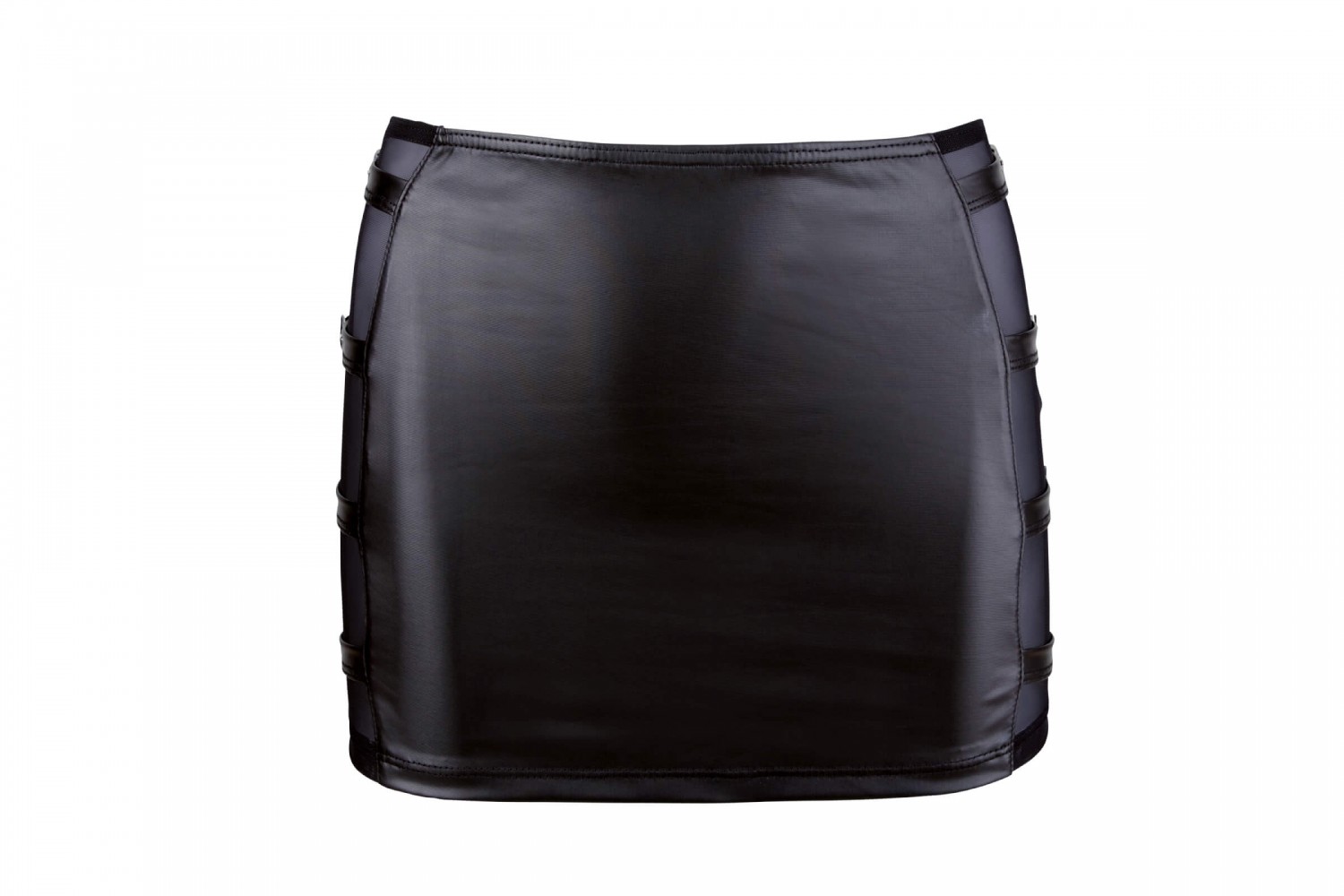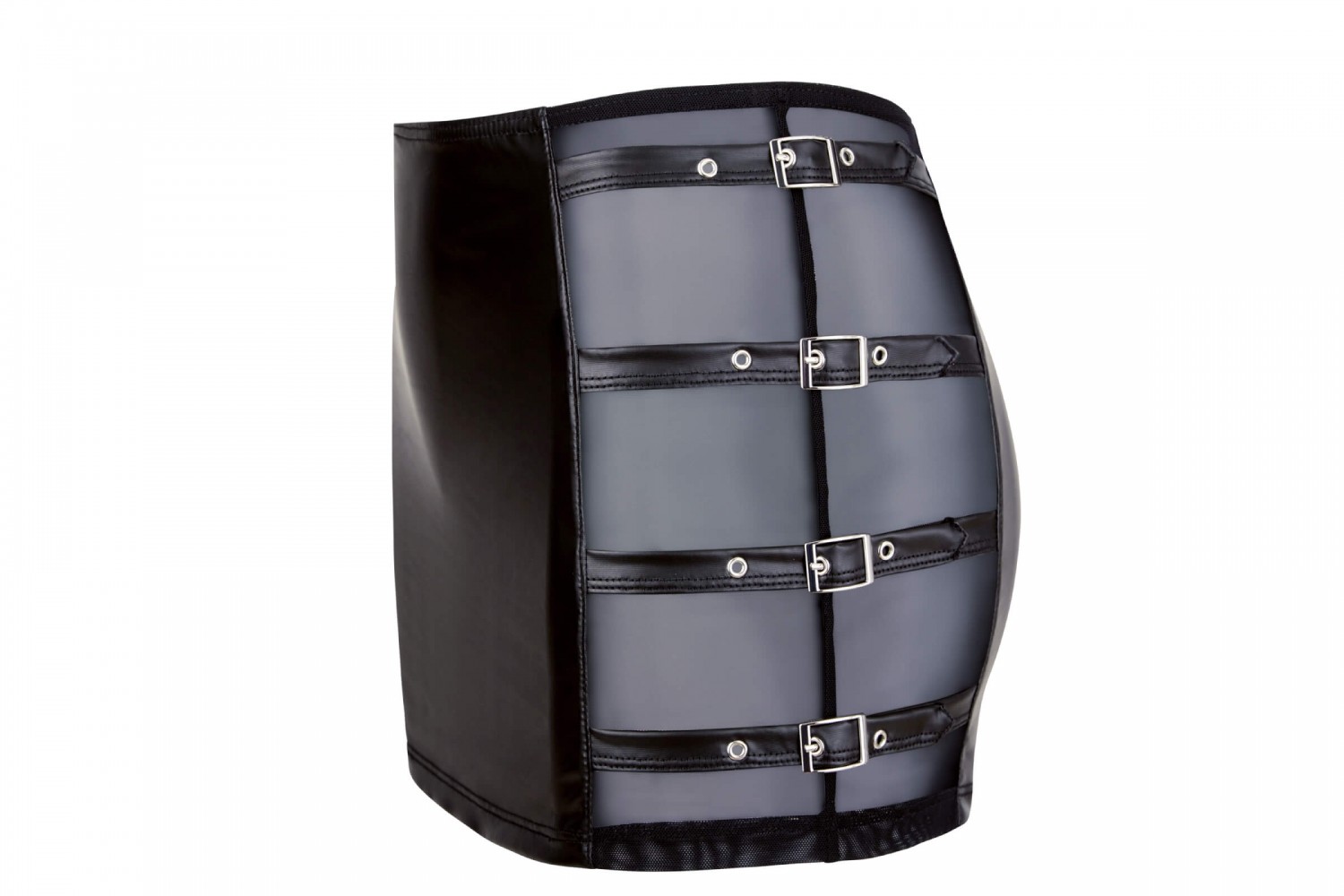 Fényes, ruganyos anyagból készülő miniszoknya, kétoldalt áttetsző necc betéttel és oldalanként 4-4 fényes pánttal, valamint fém csatokkal.