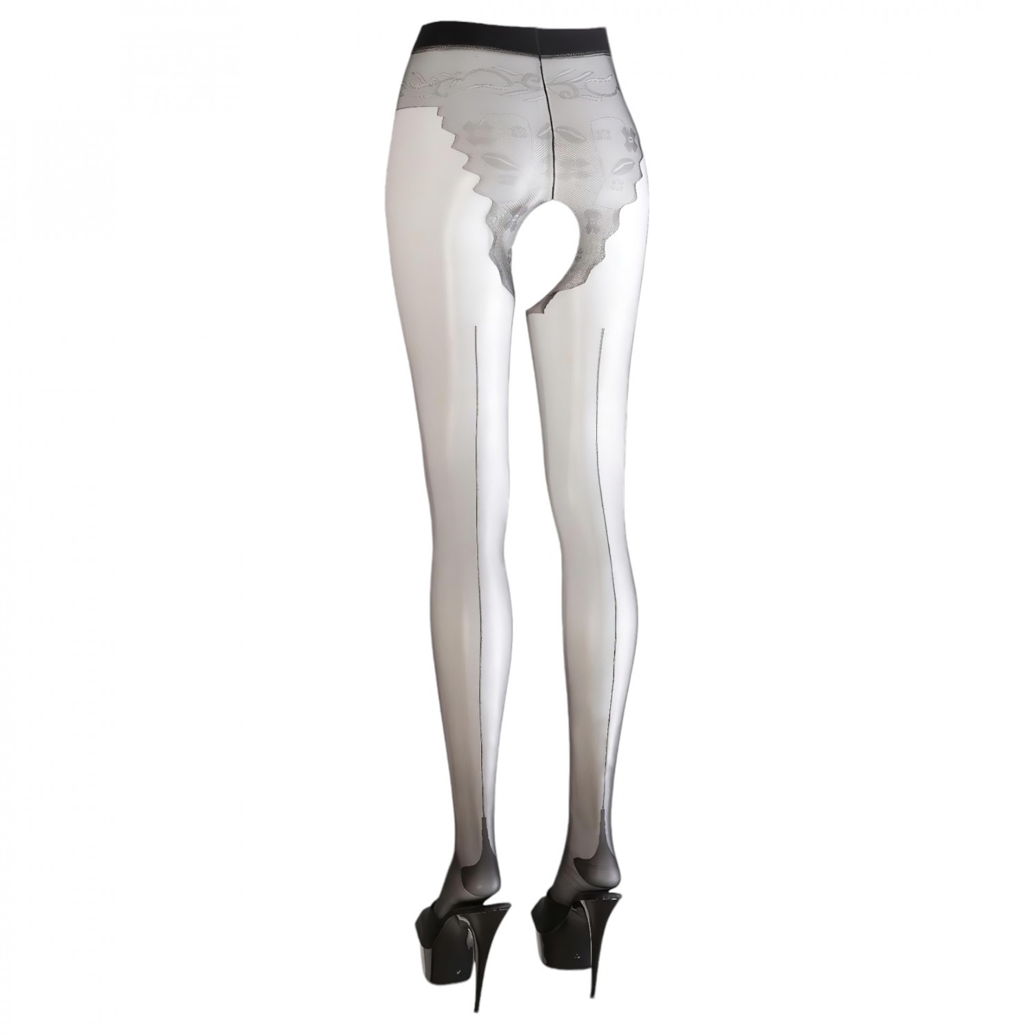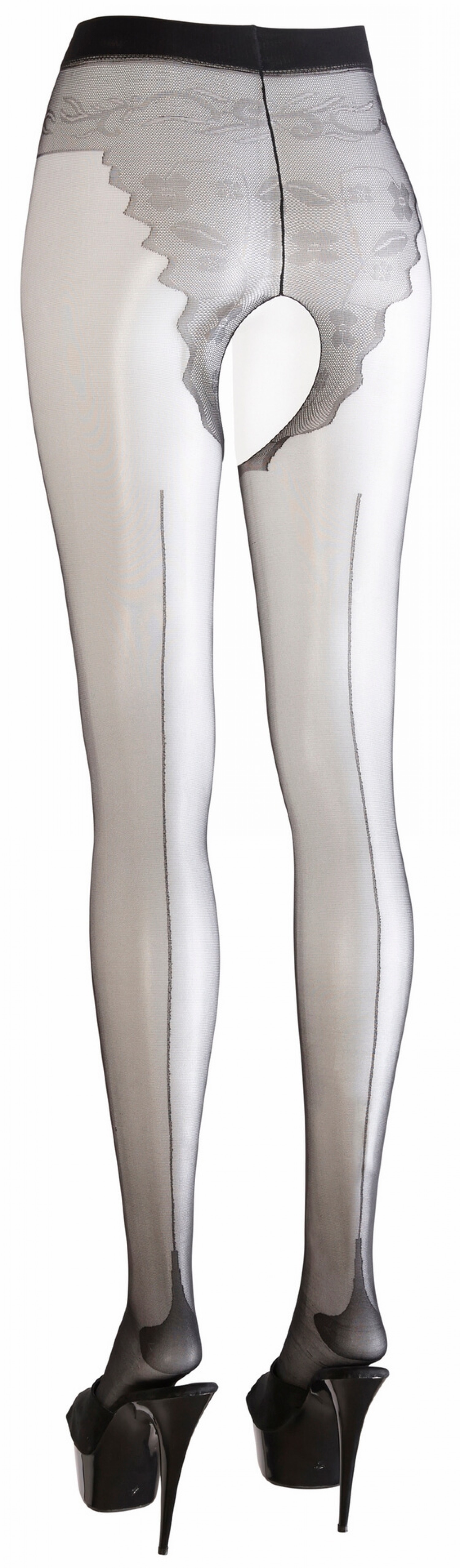 Fekete, középen nyitott szexharisnya, elöl és a fenéken különleges szövéssel, ami olyan mint egy csipkés alsó. A lábakon hátul fekete csíkkal, megerősített sarokkal. 86% Polyamid, 14% Elasthan.