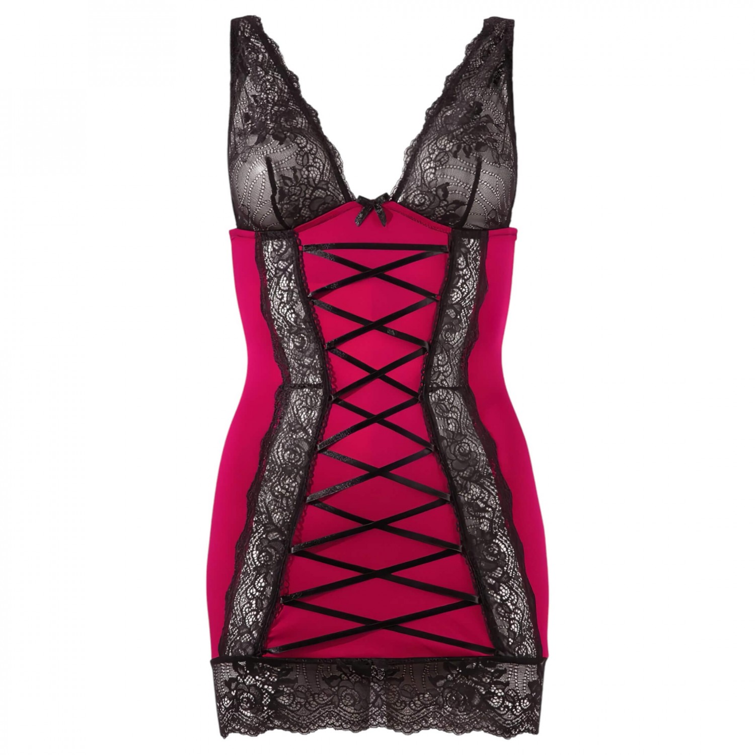 Rugalmas, piros anyagból készült miniruha, fekete, áttetsző csipkével gazdagon díszítve. Mély dekoltázzsal, állítható vállpántokkal. Elöl fekete, fűzős kialakítású szatén szalaggal díszítve.
