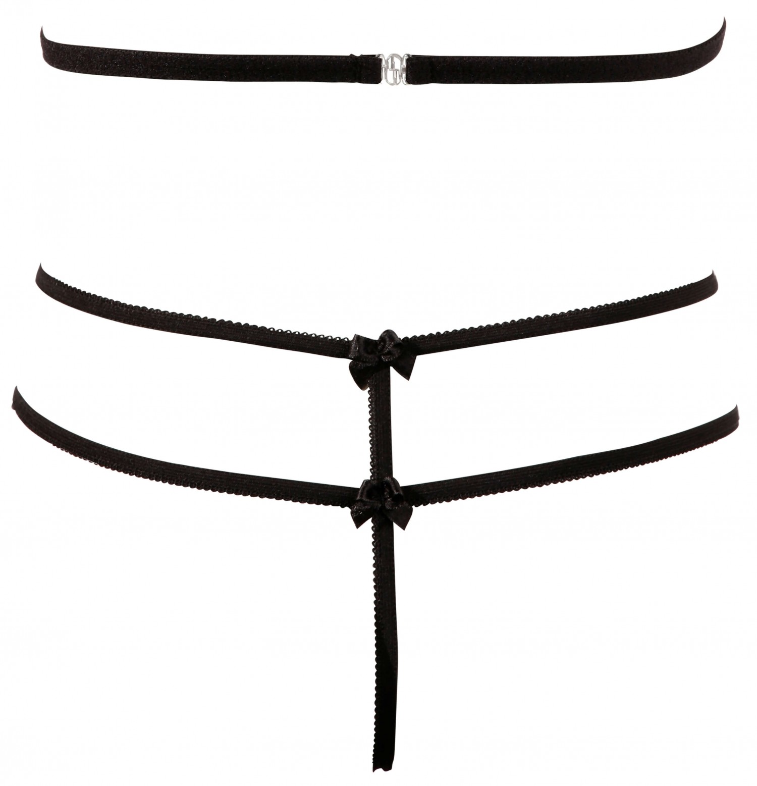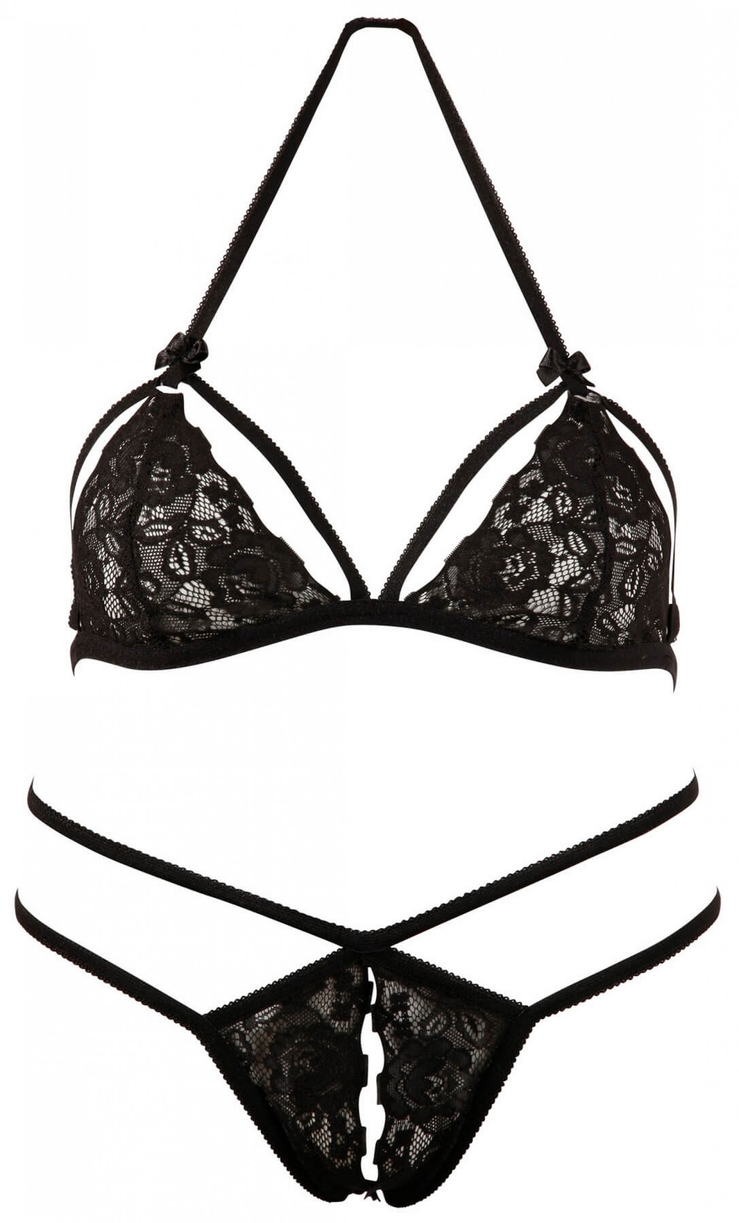 Mutatós és rendkívül szexi szett, ami biztos sikert ígér! Puha, virágmintás csipkéből készült lenyitható, nyakpántos melltartó és a szeméremnél nyitott, duplapántos tanga. Fekete színben.