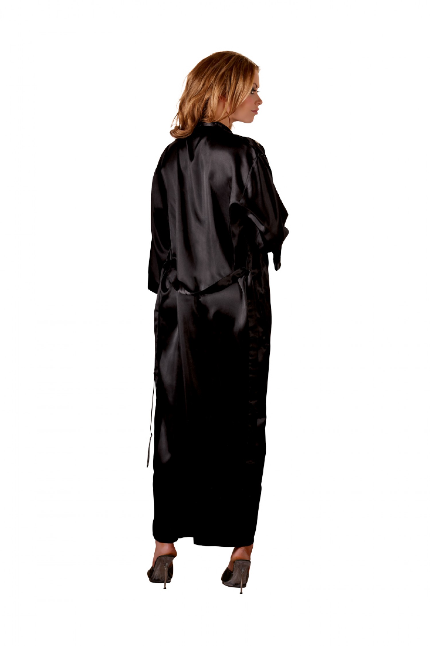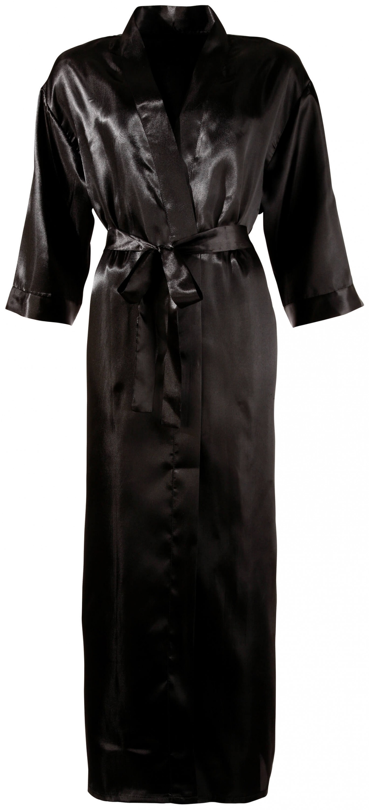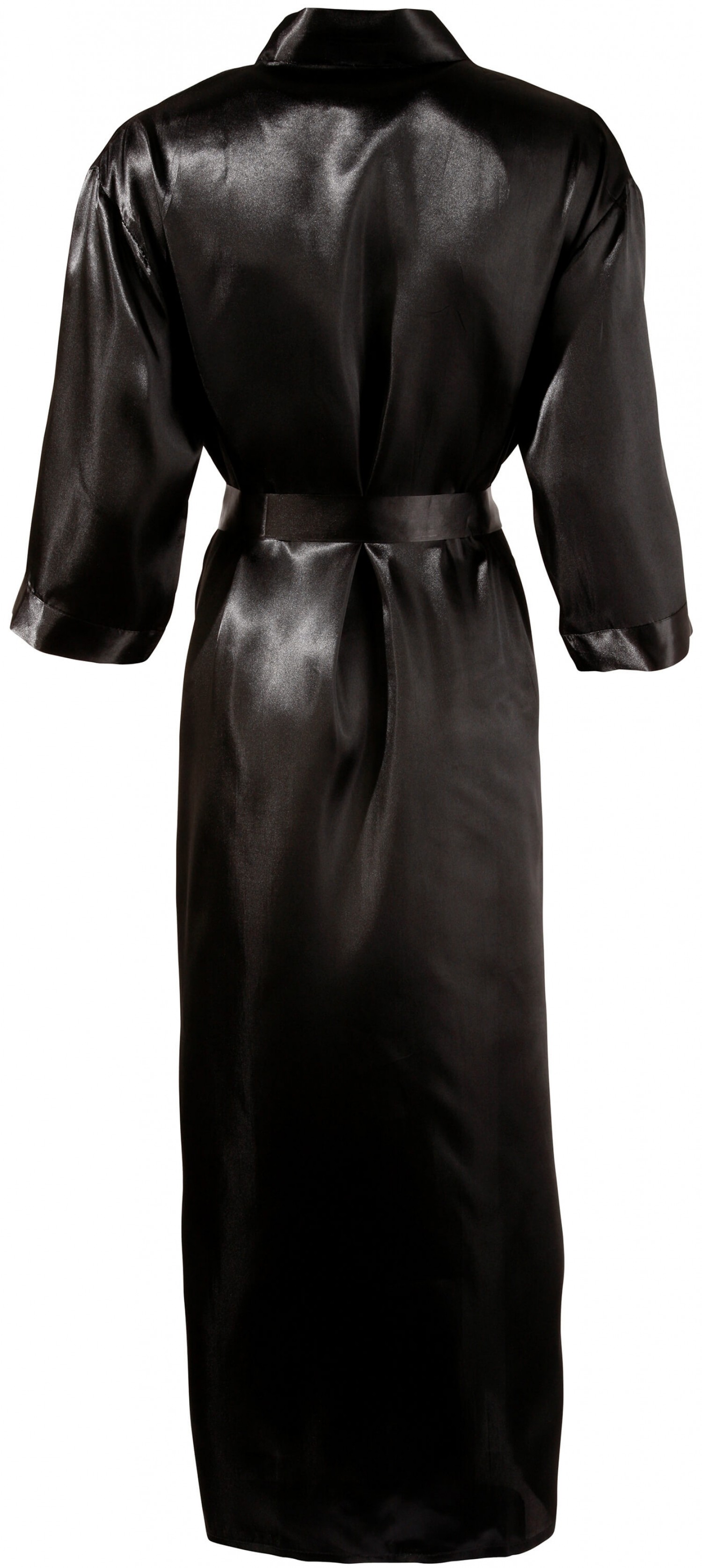 Csillogó, selymes, fekete, lágy esésű szaténból készült hosszú köntös, 3/4-es ujjakkal és a derekán megkötőpánttal. Anyaga: 100% Polyester.