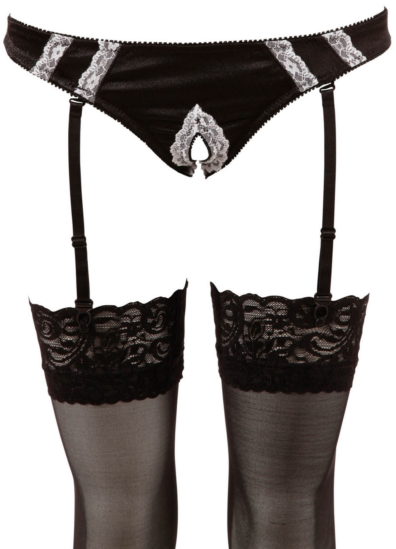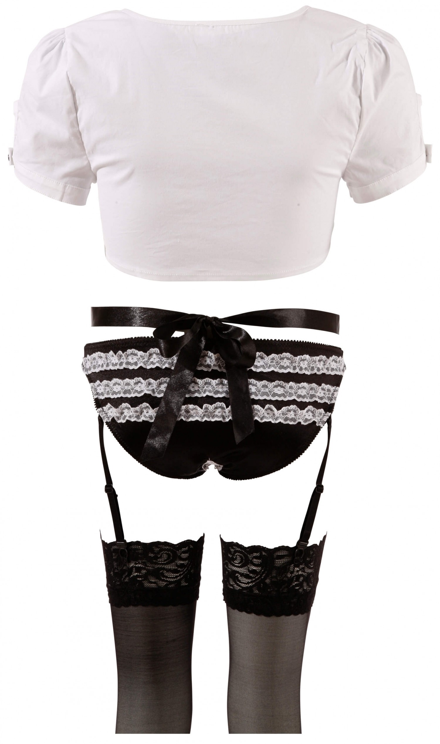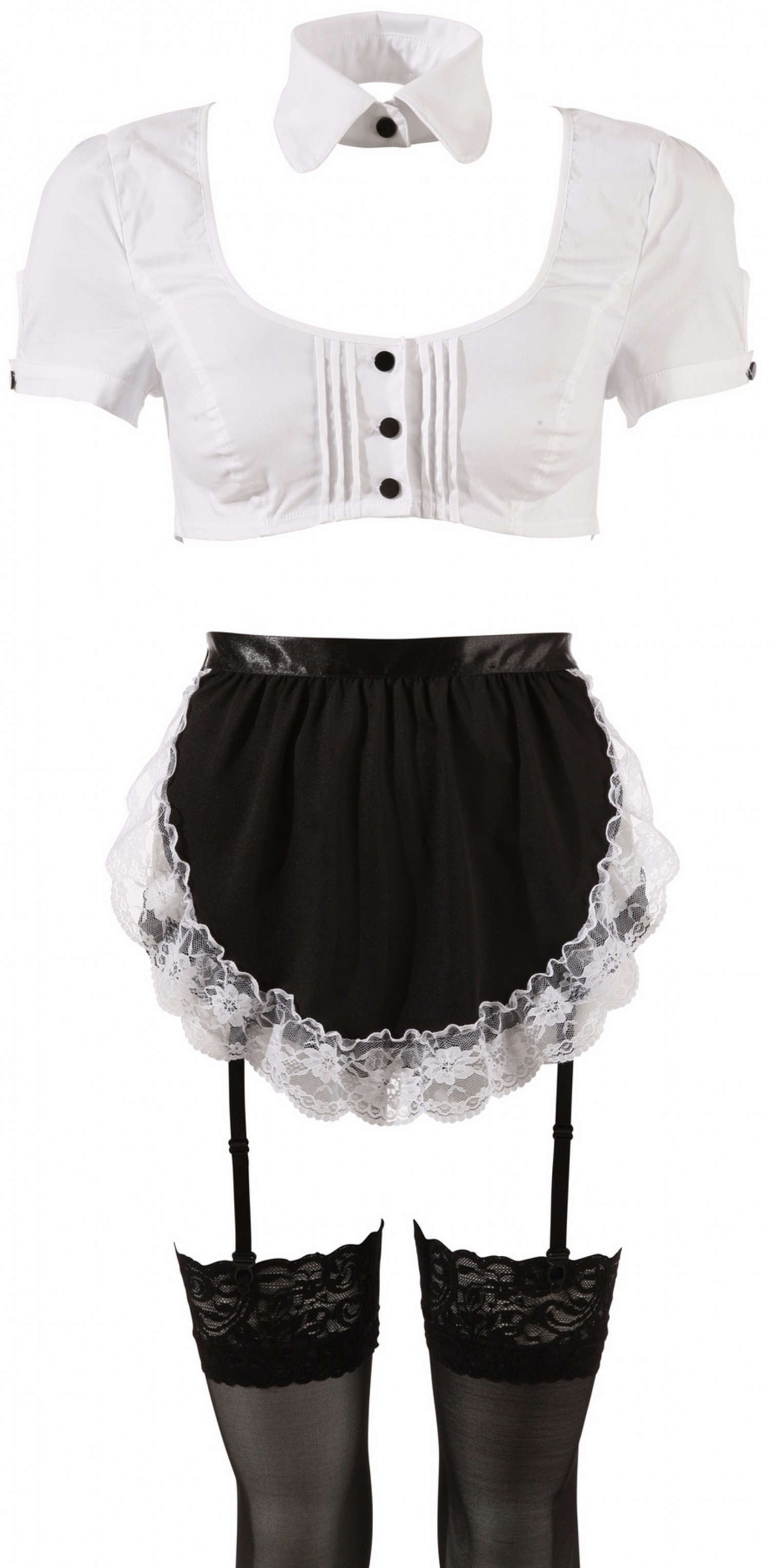 Hat részes szett. A mélyen dekoltált, rövidujjú fehér felső elöl fekete lakk gombokkal záródik. A harisnyatartós alsó fekete szaténból készül fodros, fehér csipkedíszítéssel. Szeméremnél végig nyitott, a nyílás mellett csipkeszegéllyel. A harisnyatartó pántok állíthatók és levehetők. A szett tartalmazza továbbá a fekete, csipkés harisnyát, a fehér, gombos gallért, a főkötőt hajpánttal, és a kötényt fehér csipkeszegéllyel, fekete szatén derékpánttal. A felső és a nyakpánt (80% pamut, 20% Elasthan), a harisnyatartós alsó (90% Polyamid, 10% Elasthan), a kötény és a főkötő (90% Polyester, 10% Elasthan). A harisnya (100% Polyamid). A toll cirógató nem része a szettnek.