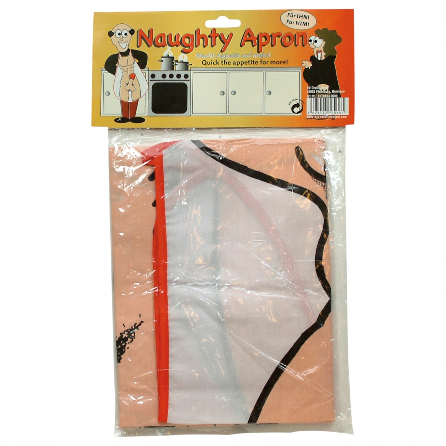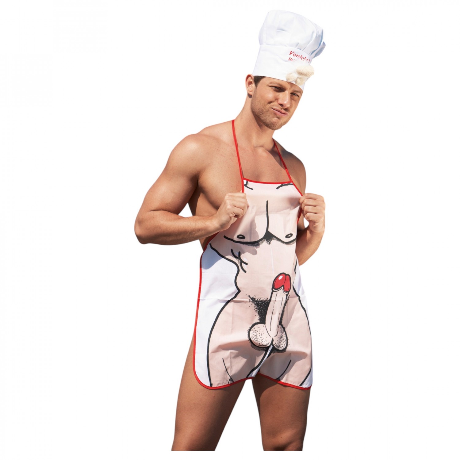 Piros szegéllyel készült, fehér, nyakpántos kötény, megköthető derékpánttal. A kötényen igazán érzéki és huncut, rajzolt akt férfi alakkal, ágaskodó pénisszel. Anyaga: 100% Polyester.