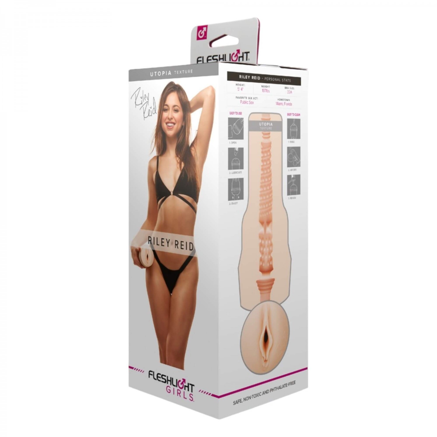 Gyengéden puha, natúr színű vagina, mely az híres pornódíva, Riley Reid ínycsiklandó szeméremajkainak lenyomatával készült. Gyönyörűen formált, érzékien szűk, de nagyon rugalmas kéjnyílással. Változatos belső felszíni kialakítással, melynek bonyolultsága az élvezeteket a kirobbanó extázissá varázsolja. A hatást még tovább fokozza a diszkrét, visszazárható, nem mindennapi dizájn tok. Fehér színben készült, egyedi, ezen termékekre jellemző, zseblámpa formájú műanyag tokkal. A kényeztető a tokból szabadon eltávolítható, így egyszerűen tisztítható. Riley még saját kézjegyével is ellátta gyönyörkapujának hű mását.