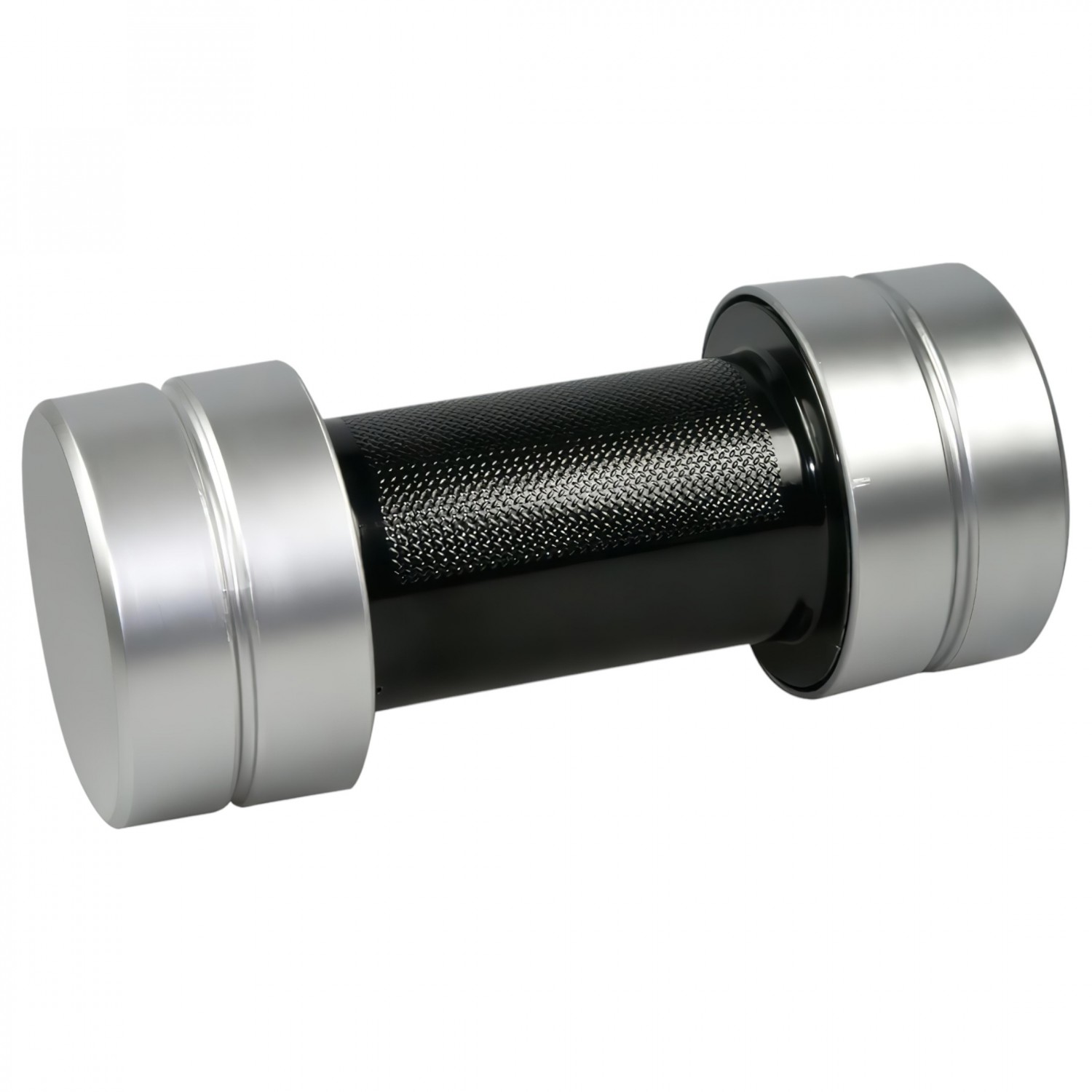 Diszkrét, puha kettős gyönyörszerző, vadító, fekete súlyzó formájú dobozban, melynek mindkét ezüst színű vége lecsavarható. Egyik végén élethű vaginával, tökéletesen formált, érzéki szeméremajkakkal, másik végén pedig popsival. Mindkettő puha, selymesen lágy, natúr színű rugalmas anyagból készült, belül stimuláló lamellákkal. A kéjnyílások érzékien szűkek, de nagyon rugalmasak. A kényeztető teljes hossza 18cm, átmérője 3cm(rugalmas). Extra ráadásként ajándék síkosítómintával. Anyaga: TPE, PET, ABS.