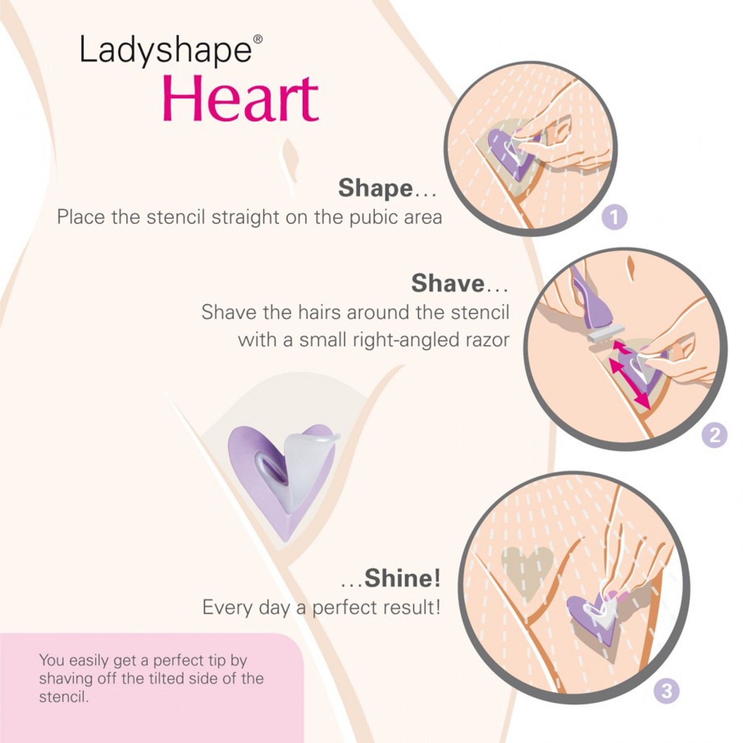 Kápráztasd el kedvesedet! A Ladyshape borotvával tökéletesen precíz fazont alakíthatsz ki magadnak. A szív alakú intim szőrzet eléréséhez helyezd a sablont a szeméremdombodra és a speciális borotvával csak borotváld körbe. Ilyen egyszerűen és gyorsan készítheted el csábítóan szexi, különleges intim fazonodat. Legyél ebben is, odalent is különleges!