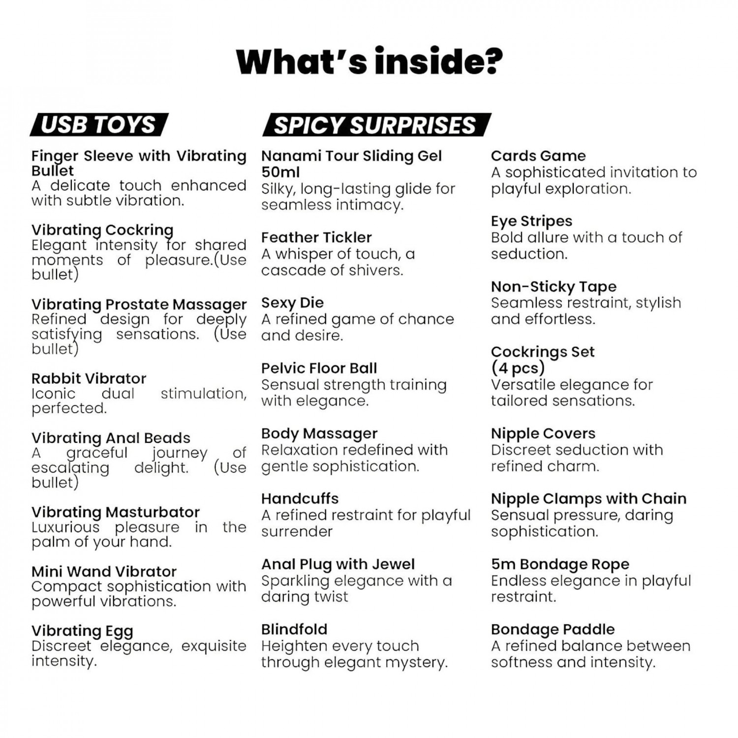 A naptár 24 különböző erotikus meglepetést rejt, melyek között találhatsz például: