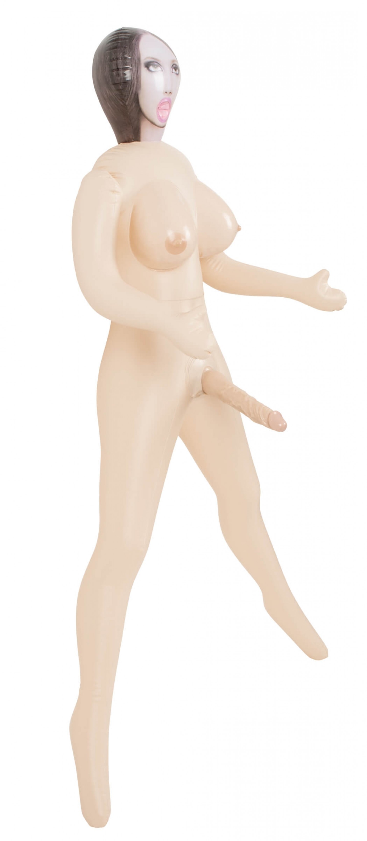 Életnagyságúra felfújható szexbaba, fotó minőségű arccal, nyitott szájjal, feszes keblekkel, hegyes mellbimbókkal.