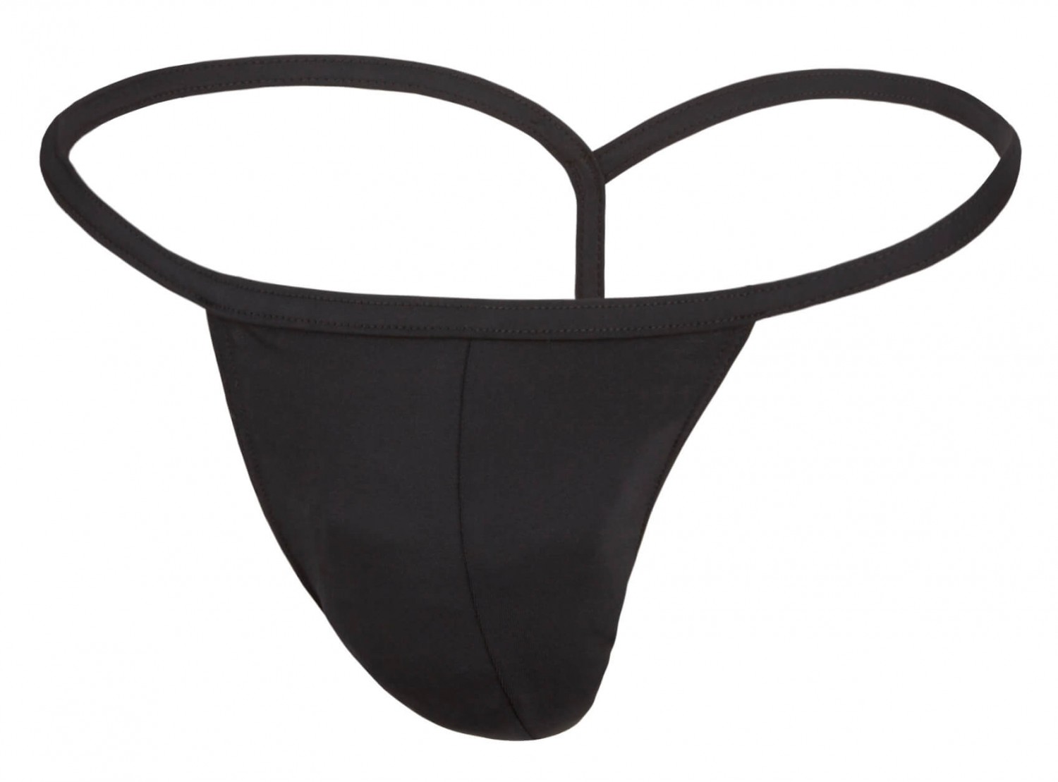 Rugalmas, fényes, fekete anyagból készült tanga, T-fazonban, elöl a férfiasságot kiemelő szabással.
