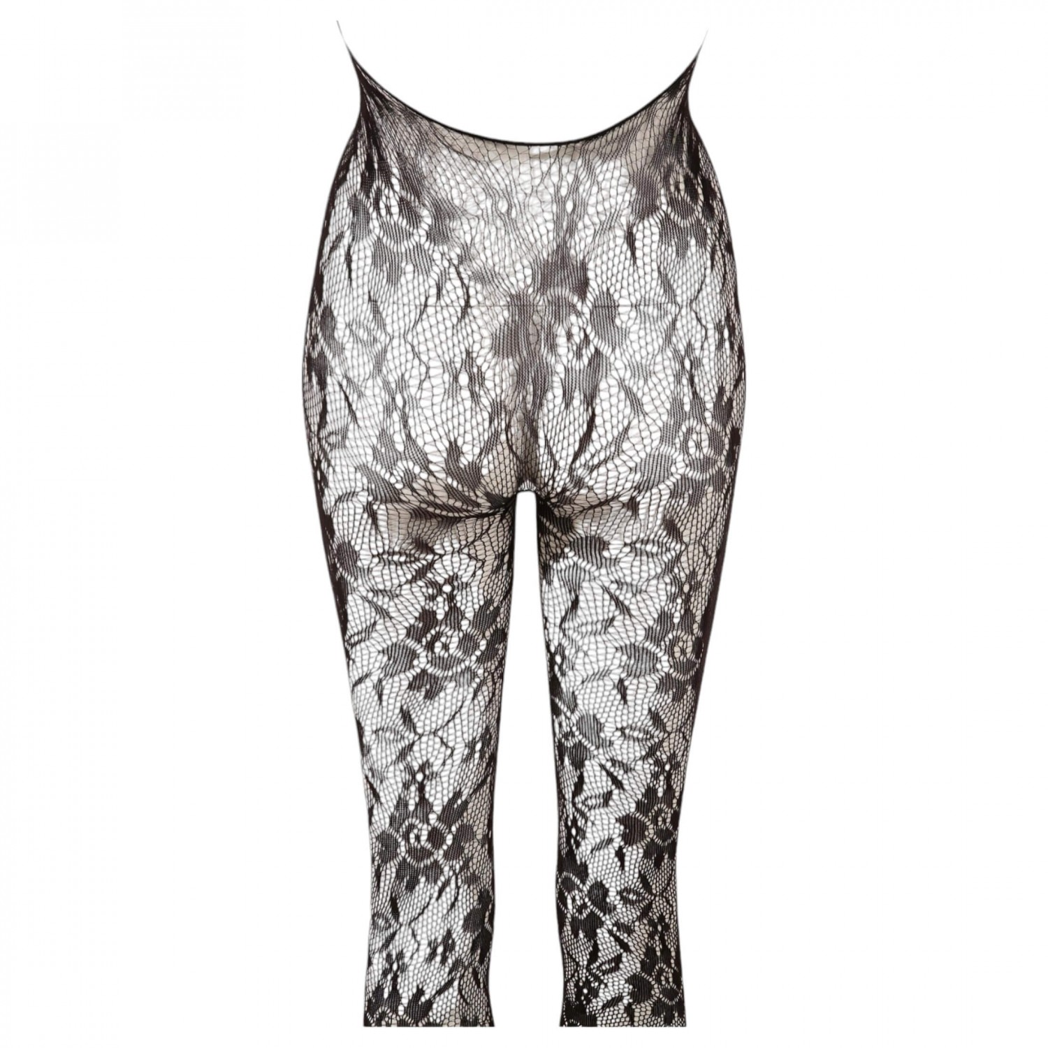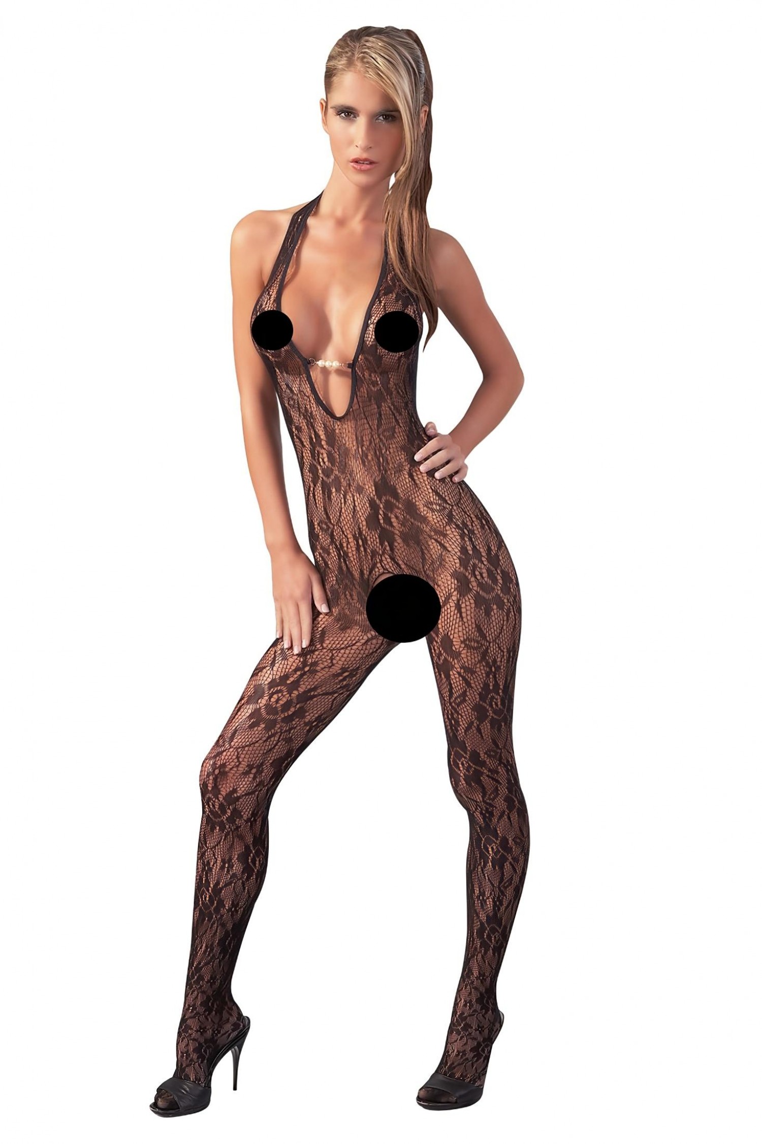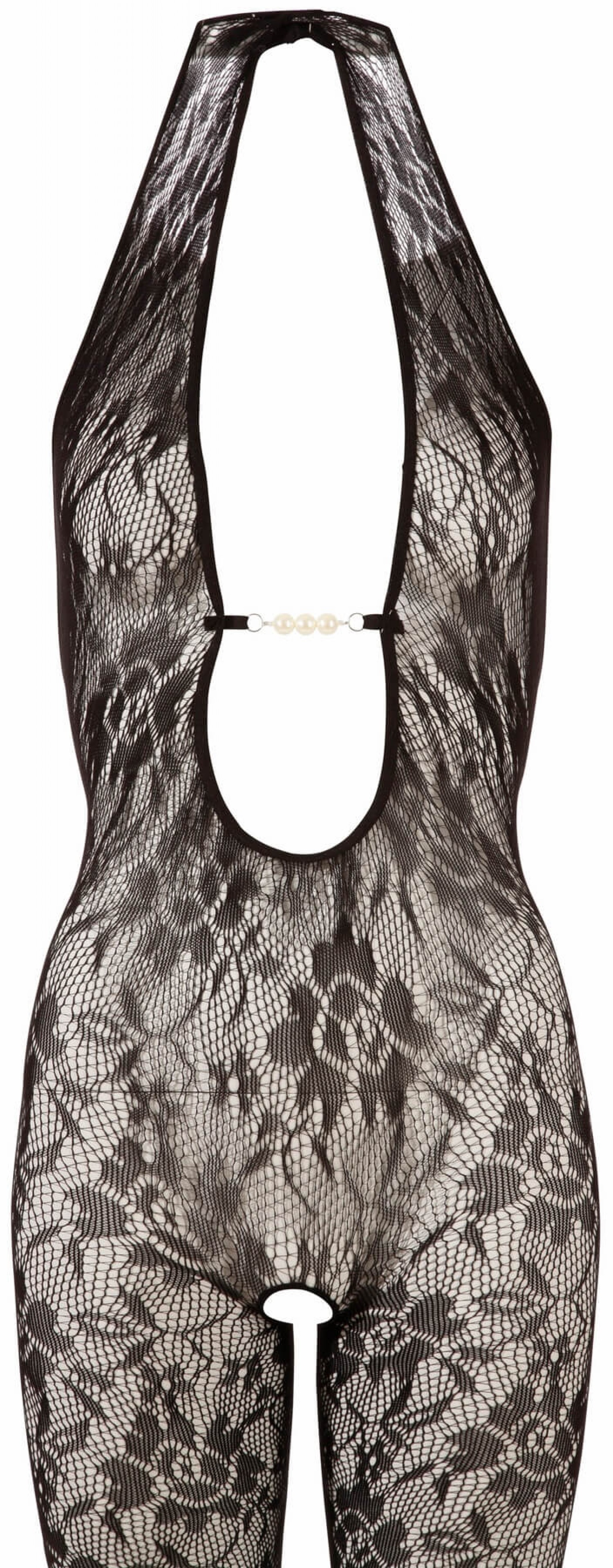 Puha csipke tetőtől talpig. Látványos szövésű, rugalmas csipkéből készült, szeméremnél nyitott overall, mély, gyöngyökkel díszített dekoltázzsal. Nyakpántos kialakítású, mély hátkivágással. Fekete színben. Mérete: S/M. Anyaga: 100% Polyamid.
