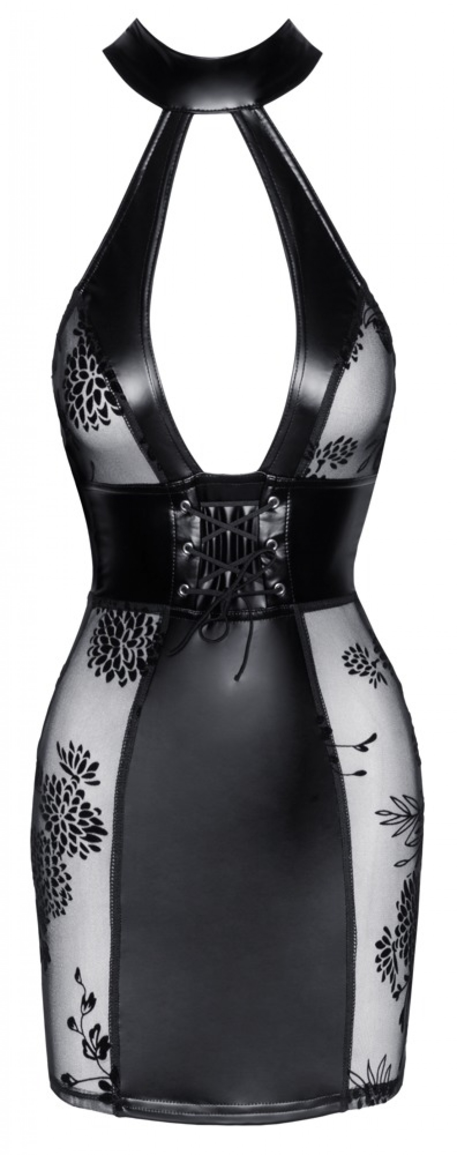A felső részen és alul, oldalt virág mintás, áttetsző betétekkel, melyek betekintést engednek a csupasz bőrre és kicsit a kivillanó mellbimbókra.
