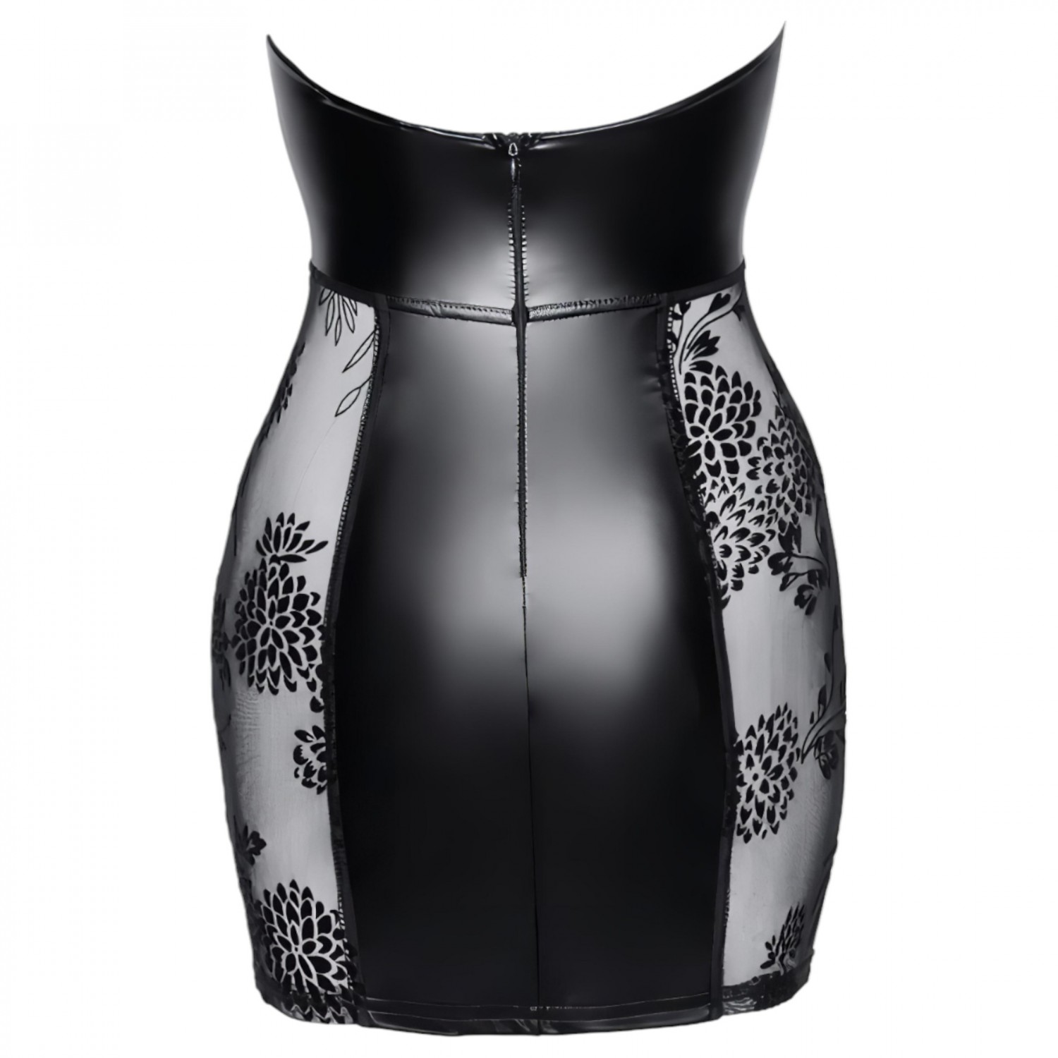 Magas minőségű, rugalmas, fényes hatású, puha anyagból készülő ruha. A vállakat szabadon hagyó, ujjatlan kialakítással, szexi mély dekoltázzsal.