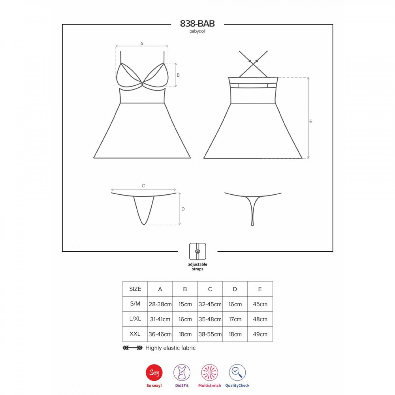 Puha, rugalmas anyagból készülő, kényelmes babydoll, felül pikáns, nyitott részletekkel, alul lenge, A-vonalú fazonban, így a csípőben erősebb Hölgyeken is tökéletesen mutat.