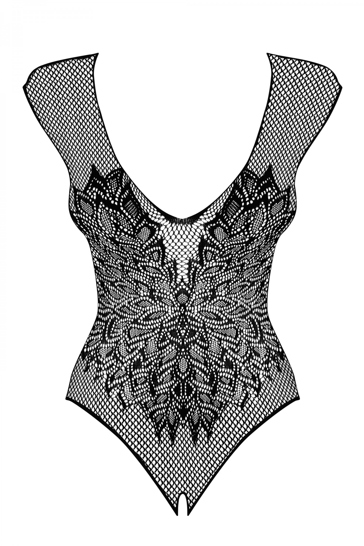 Sűrű szövésű, aprószemű, rugalmas necc anyagból készülő body, mély V-alakú dekoltázzsal, ujjatlan fazonban.