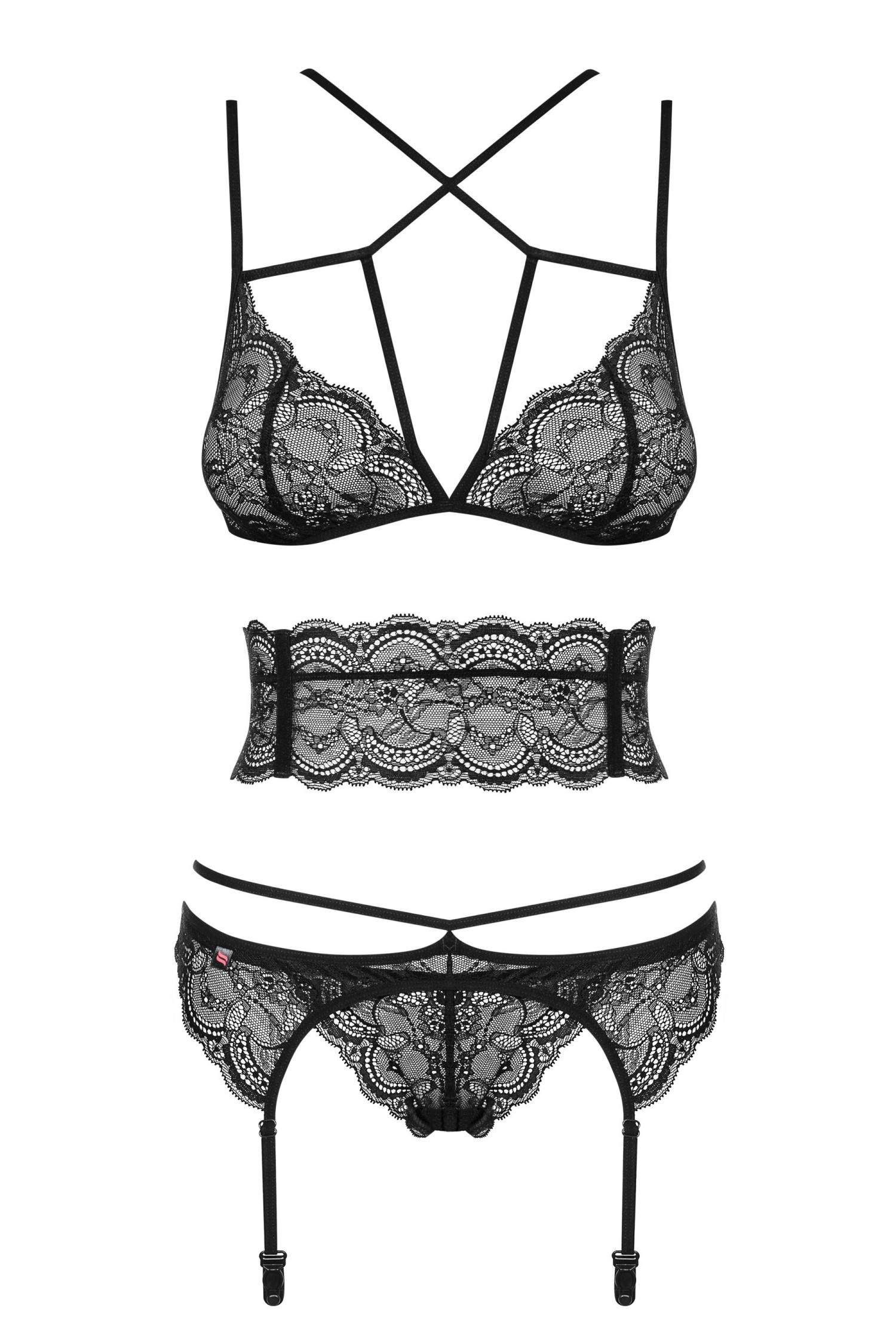 Az Obsessive Frivolla szett hihetetlenül gyönyörű és csábítóan szexi. Rugalmas, tökéletesen kidolgozott csipkéből és a látványt még jobban növelő pántokkal, amely garantálja, hogy egyedi érzésben lesz részed. A szett 4 részből áll, így már csak egy szuper szexi harisnyára lesz szükséged. Nyűgözd le a párodat és saját magadat is!