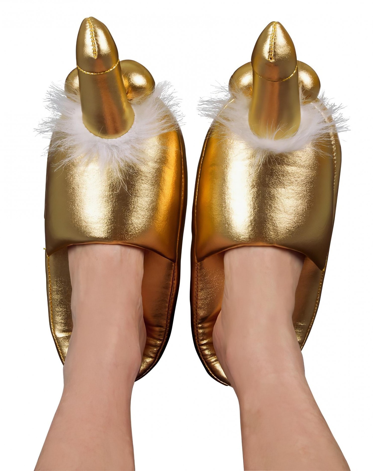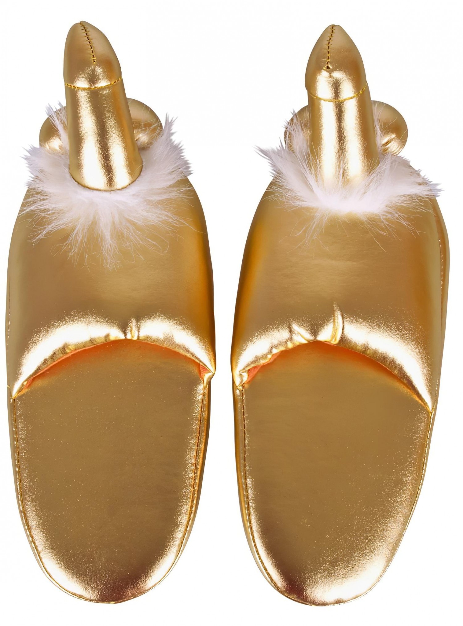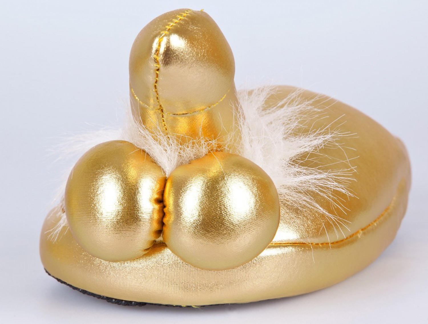 Nagyon kellemes, puha, látványosan csillogó arany színű anyagból készült papucs (1 pár), melynek tetején, formás, ágaskodó pénisz csücsül, kerek herékkel és selymes, fehér szőrrel.