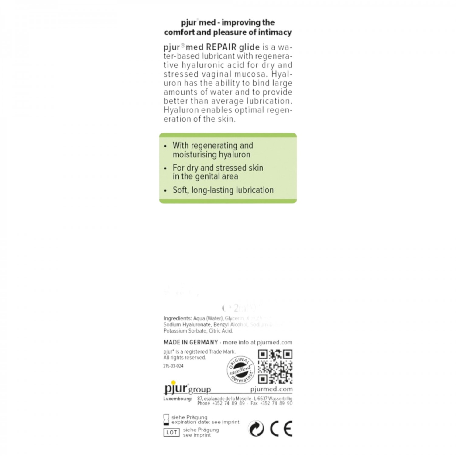 Vízbázisú síkosító gél hyaluronsav hozzáadásával a bőr, és a nyálkahártya nedvességtartalmának helyreállításához. Hosszantartó síkosító hatással. Szintetikus színezék-, illat-, olaj- és zsír hozzáadása nélkül készül, paraffint nem tartalmaz. Kiváló minőségű bőr és nyálkahártyabarát készítmény. Bőrgyógyászatilag tesztelt, óvszerbarát termék. 100ml-es kiszerelés.