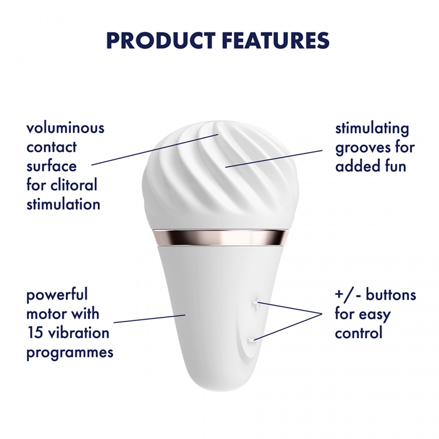 A Satisfyer Sweet Sensation vagyis az új nevén a Satisfyer Lay-On Little Wand fehér fagyi formájú csiklóizgató, minden vágyadat kielégíti. Bőrbarát, selymes tapintású anyagból készült, melynek már az érintése is izgalmas vágyakat ébreszt. A Sweet Sensation kompakt méretének köszönhetően, nagyon kis helyen elfér, így utazáshoz is tökéletes társ lesz. Egyszerű vezérléssel a 15 féle rezgésmód között, mindig megtalálod majd a hangulatodnak és igényednek megfelelőt. Töltése USB kábellel könnyedén újratölthető és folytatódhat tovább az édes kényeztetés.