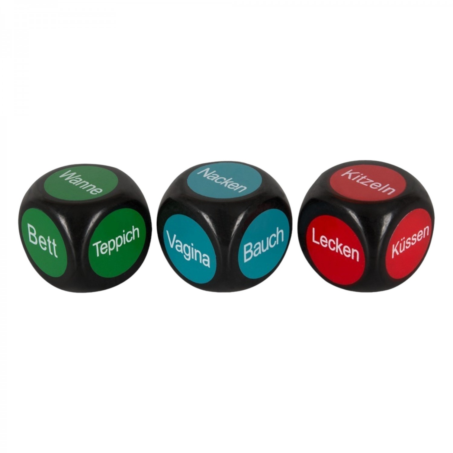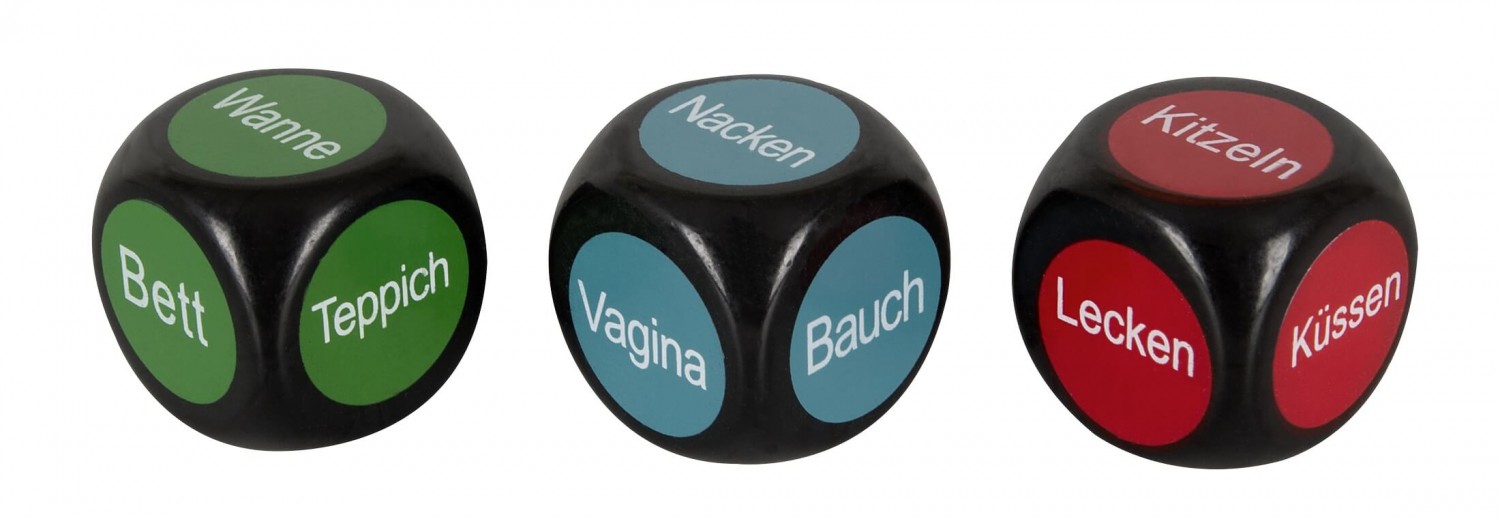 3db-os játékos kocka szett. A vörös dobókocka mutatja meg hogy mit kell tenni, a kék hogy melyik testrésszel, a zöld pedig, hogy milyen helyszínen.