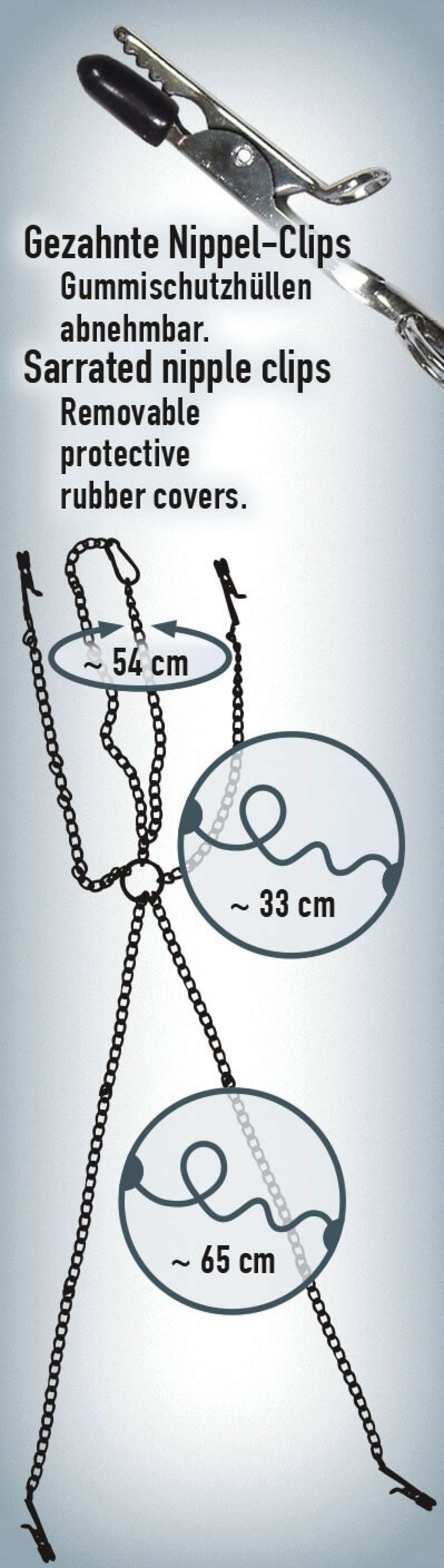 A mellek közötti gyűrű (átmérője 3,5cm) a nyakláncot, a két mell-láncot kapcsokkal (mindkettő kb. 30cm hosszú) és a két szeméremajak-láncot (mindkettő 66cm) kapcsolja össze. A nyaklánc mérete karabínerrel állítható.