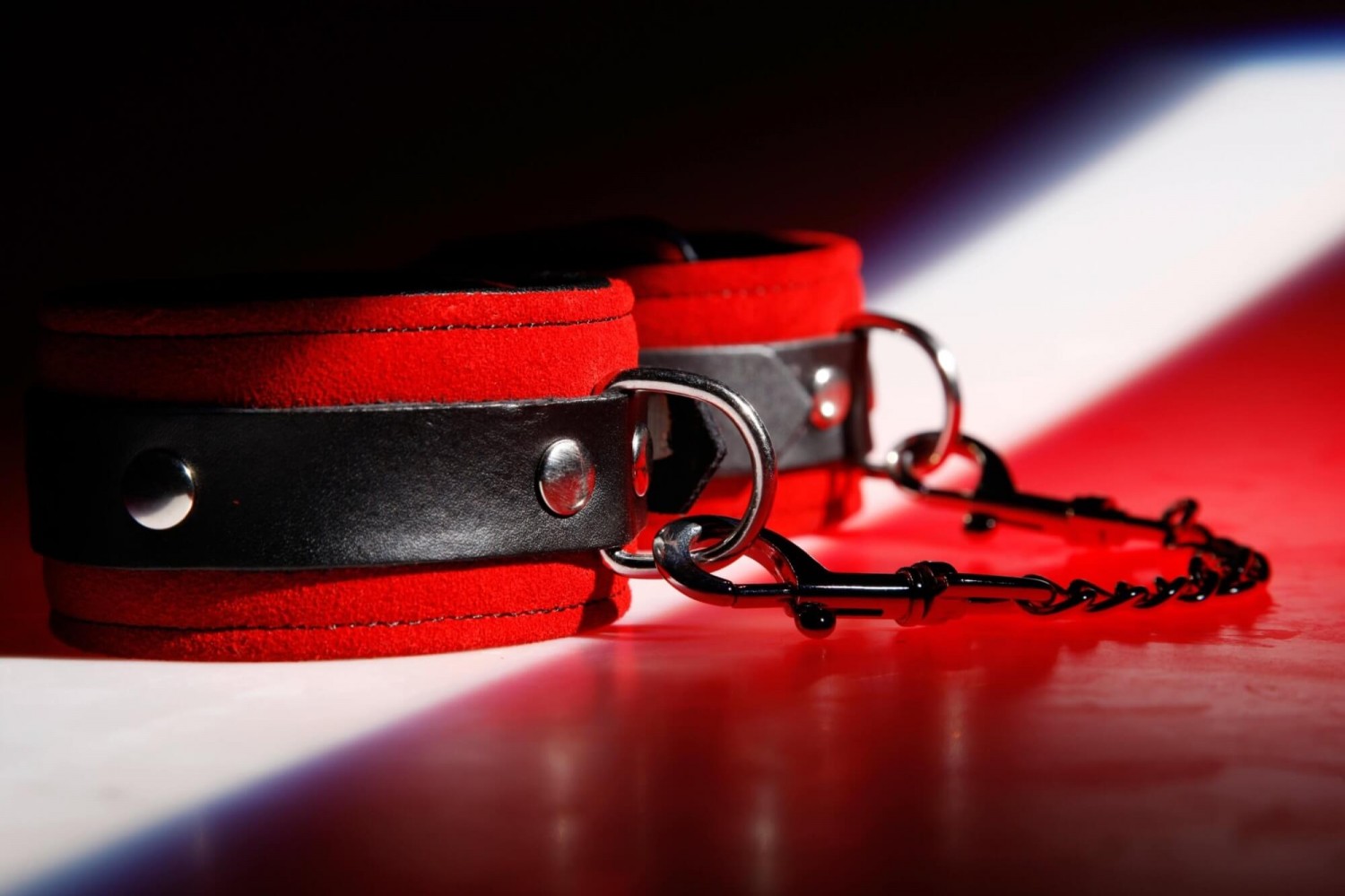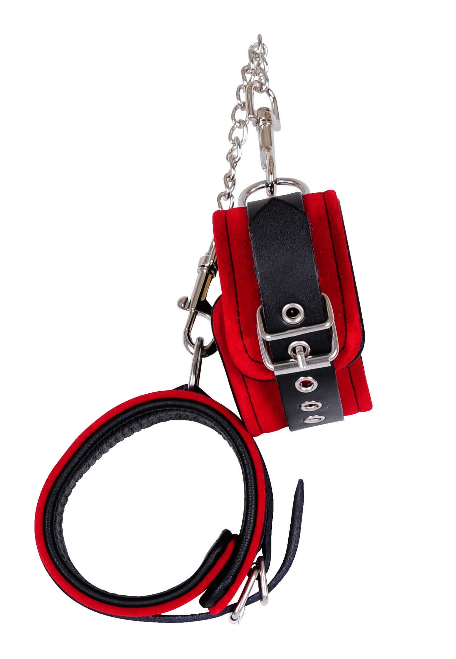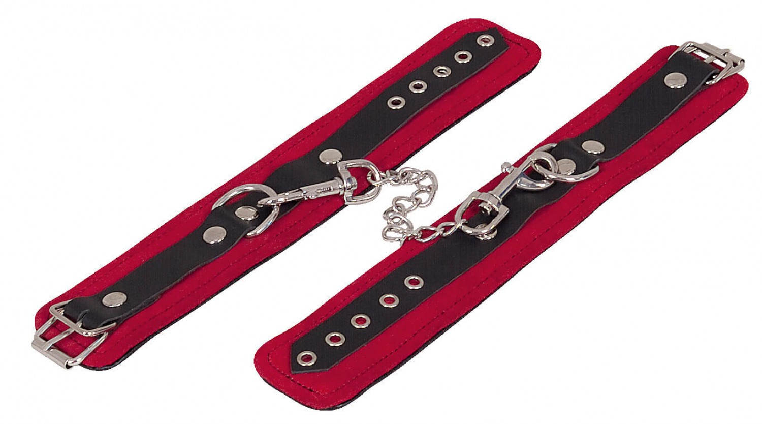 Két 5,5cm széles, állítható bokamandzsetta, melyet 10cm hosszú, levehető fém lánc köt össze, a két végén karabínerrel. Fekete bőrből, vörös velúr borítással. Egy-egy D formájú, fém rögzítőgyűrűvel.