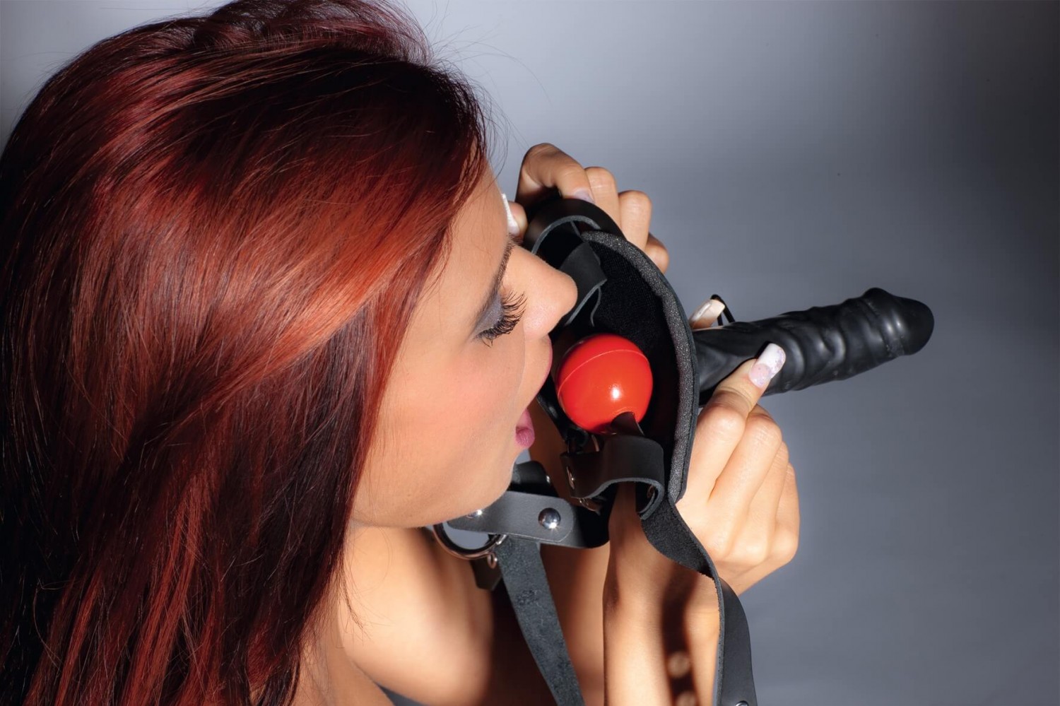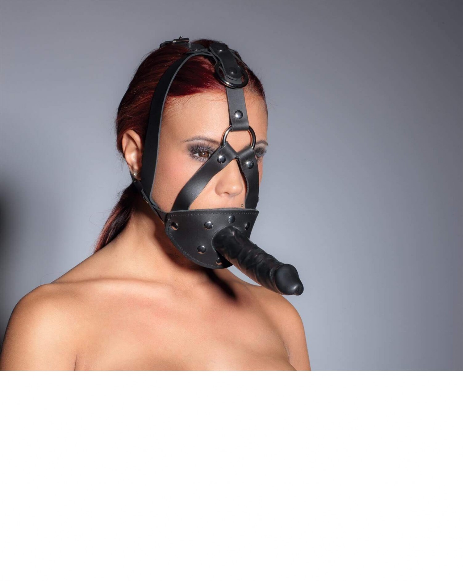 Kiváló szakítószilárdságú, valódi bőr pántokból készült fejmaszk, fém gyűrűkkel, szegecsekkel díszítve, mérete tetszőlegesen, csattal állítható. Különlegessége a külső, beépített fekete latex műpénisz, erezett felszínnel, mely 13cm hosszú, átmérője 3,5cm. Valamint a mindig csendességre intő belső, beépített piros szájgolyó (Anyaga: PVC.), melynek átmérője 4cm. A pecek és a dildó is rögzíttek, nem kivehetőek.